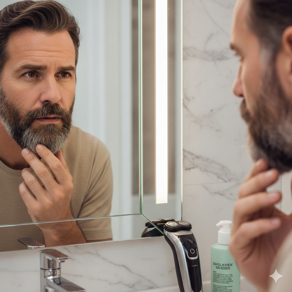 2. 見た目が老けて見える: 髭剃り跡が「黒い毛」と「白い毛」の斑点状になり、かえって老けた印象を与えてしまうことも。